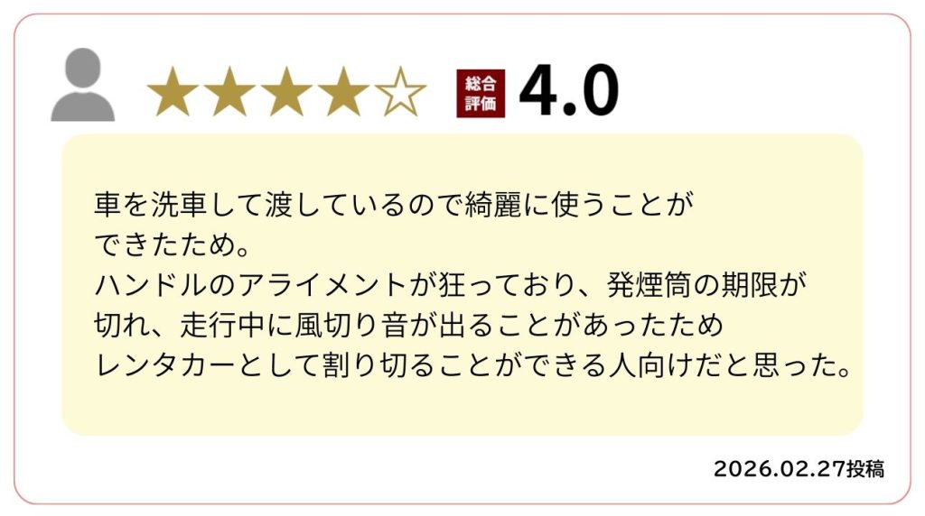 ご利用いただきましたお客様のリアルなお声をご紹介します。嬉しいお声も、ちょっと厳しいお声もあります。         レンタカー選びのご参考にご覧ください。